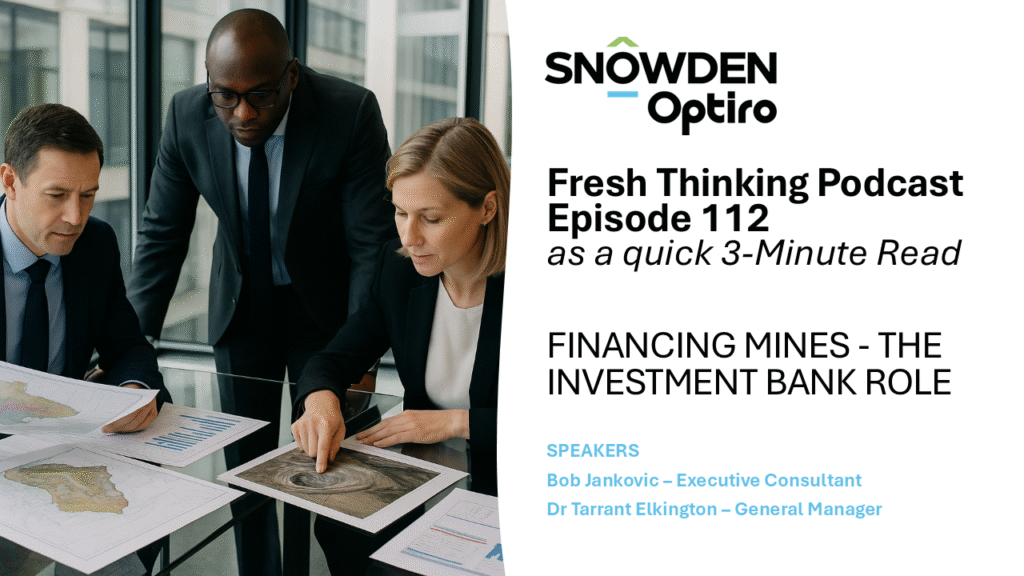 In this episode of Fresh Thinking, Snowden Optiro General Manager Tarrant Elkington speaks with our Executive Consultant Bob Jankovic to discuss the investment bank’s role in mining – and what mining companies should know if they want to secure funding or position themselves for acquisition.