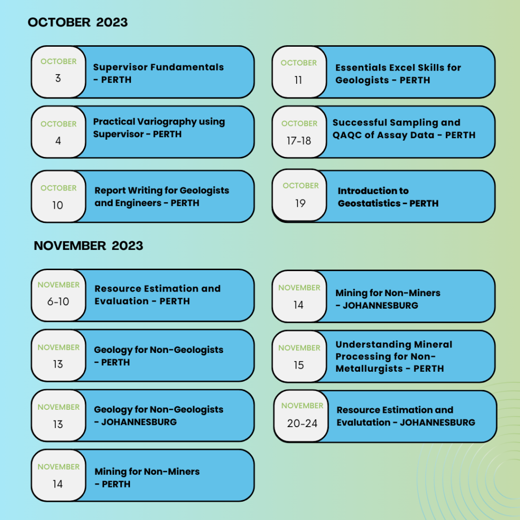 Please note that all our courses can be customized for Inhouse training to suit your mine’s specific requirements. Please contact me if you would like a quote.